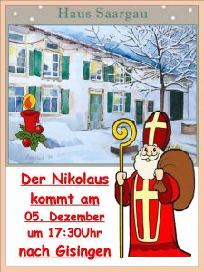 Am Sonntag, 30. November 2025 findet der mittlerweile schon traditionelle Adventsmarkt von 10 bis 19… Adventsmarkt in Gisingen am 1. Advent weiterlesen - Nikolausabend im Haus Saargau Gisingen