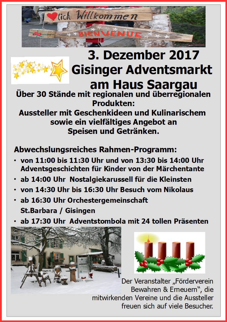 Am Sonntag, 03. Dezember 2017 findet der mittlerweile schon traditionelle Gisinger Adventsmarkt rund um das Haus Saargau statt. Von 10 bis 19 Uhr werden an insgesamt über 30 Ständen regionale und überregionale Produkte angeboten.