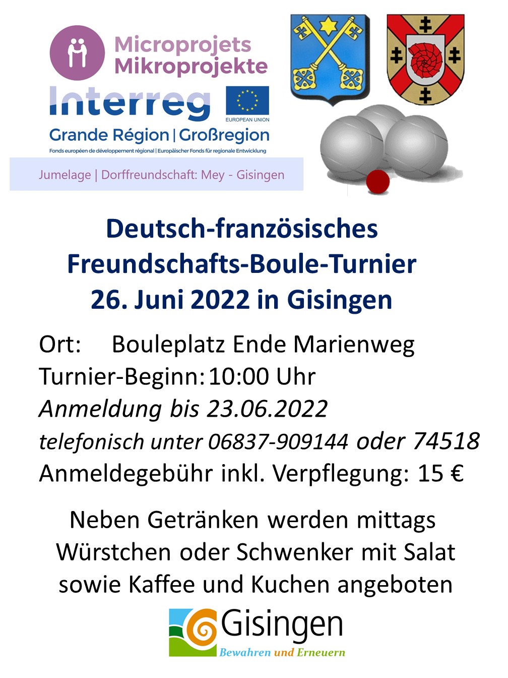 Am 26. Juni 2022 findet im Rahmen des von der EU geförderten Interreg VA Projektes „Vertiefung der Dorffreundschaft zwischen Gisingen und Mey“ die nächste Aktion statt. Projektträger sind die Gemeinde Mey und der Förderverein Bewahren und Erneuern Gisingen.