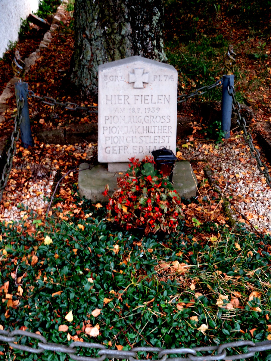 Nach Ausbruch des 2. Weltkrieges wurde Gisingen Anfang September 1939 geräumt und die Bevölkerung wurde in Richtung Thüringen evakuiert; dieser Dorfeingangsbereich wurde von deutschen Pionieren vermint. Am 18.09.1939 traten vier Soldaten, als sie Schutz vor einem französischen Fliegerangriff suchten, hier auf eine Mine – obwohl ein Minenplan existierte. Der Gedenkstein erinnert noch heute an diesen tödlichen „Kriegsunfall“; beerdigt wurden die vier Soldaten auf dem Ehrenfriedhof Saarwellingen. Der Gedenkstein stand ursprünglich auf der anderen Straßenseite; er sah auch anders aus: Der Sockel mit Hakenkreuz trug die Aufschrift „Gefallen für Führer, Volk und Vaterland“. Als der Stein beim Bau des Transformatorhäuschens im Wege stand, setzte man ihn an die jetzige Stelle. Später wurde der Sockel entfernt.
