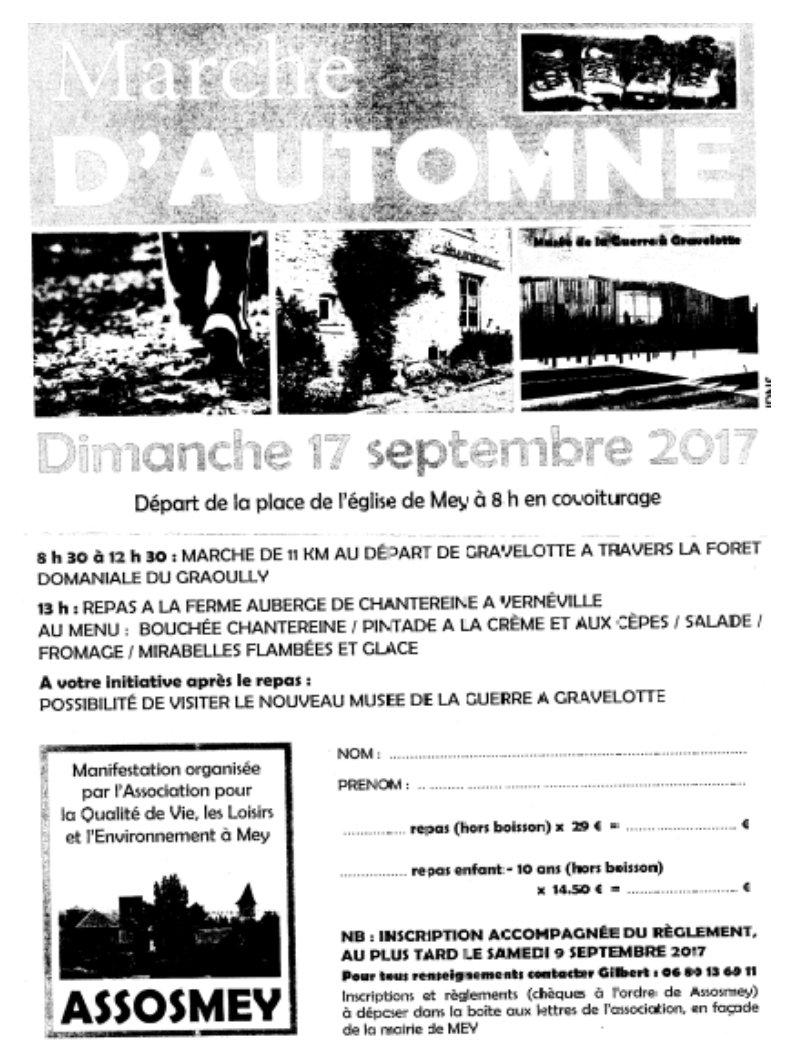 der Verein „Assosmey“ unseres Partnerdorfes Mey plant am 17. September 2017 eine Wanderung in Gravelotte. Treffpunkt ist um 08:00 in Mey an der Kirche, dort werden für die Fahrt Fahrgemeinschaften gebildet. Die Wanderung durch den Wald von Graoully hat eine Länge von ca 11 km;