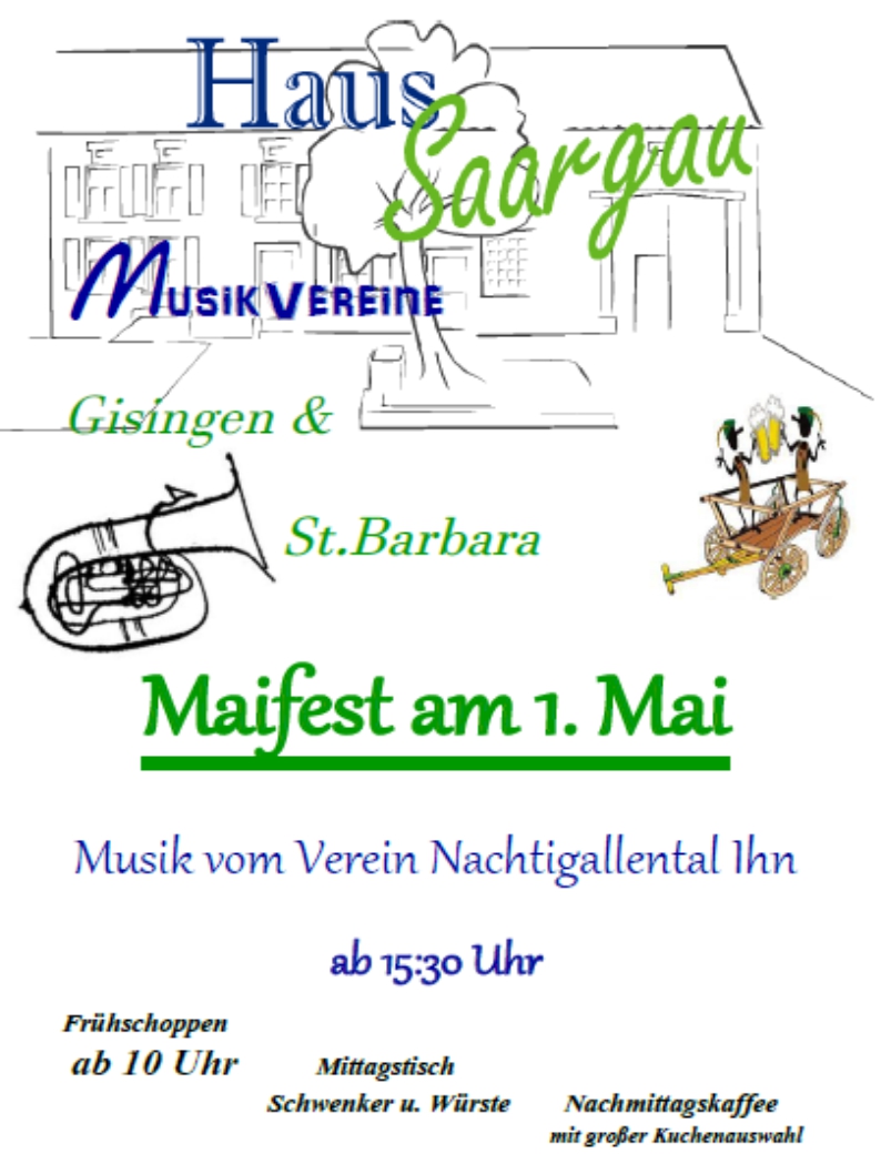 Am 1.Mai 2017 veranstalten der Musikverein Gisingen und der Musikverein St.Barbara gemeinsam das traditionelle Maifest rund um das Haus Saargau in Gisingen.