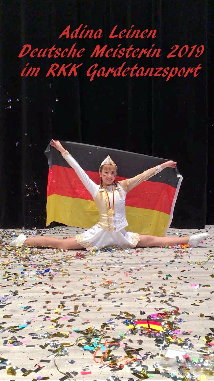 Am Samstag und Sonntag, 30.11.2019 und 01.12.2019 fand in Aachen die Deutsche Meisterschaft der RKK im Gardetanzsport statt. Adina Leinen vom TSC Gisingen-Brotdorf startete in der Disziplin Gardetanz-Solo- Tanzmariechen. Mit der Startnummer 16 und somit letzte Tänzerin der Disziplin überzeugte Adina mit ihrem Können und mit Perfektion.