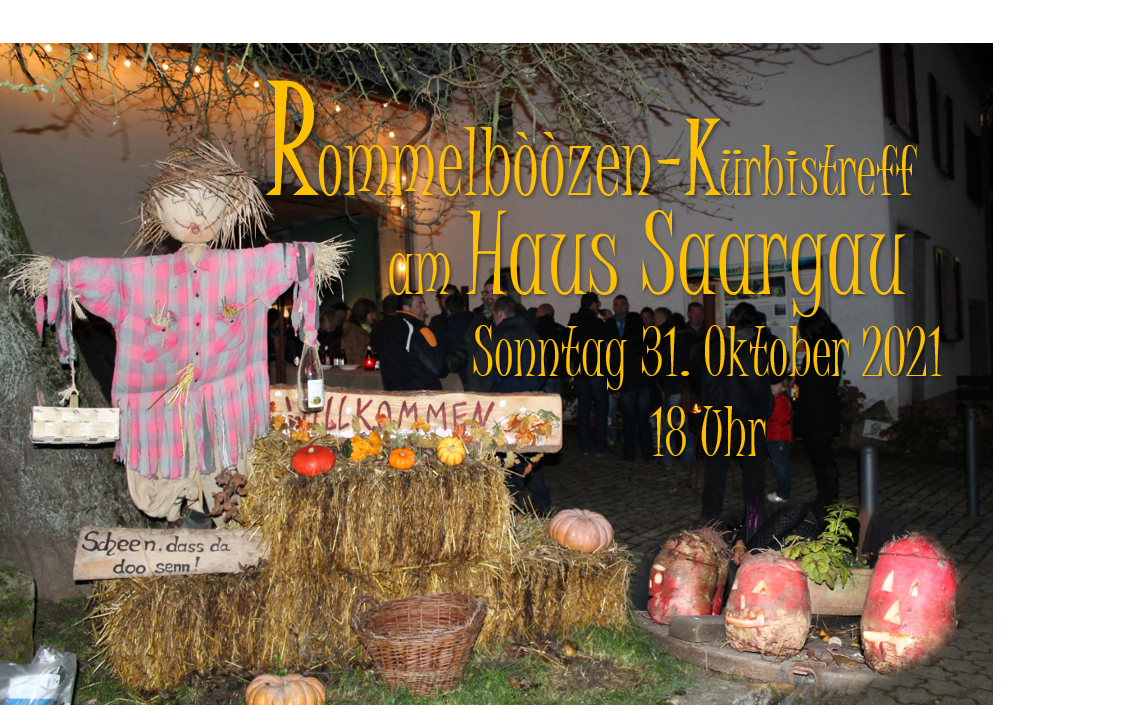 Damit der Brauch der Rübengeister um Allerheiligen nicht verloren geht, veranstaltet der Förderverein „Bewahren & Erneuern Gisingen“ in diesem Jahr wieder das Rommelboozen- und Kürbisfeschd. Das Fest beginnt am Sonntag, 31.10.2021 um 18:00 Uhr am Haus Saargau. Für hungrige Boozen und verkleidetete Gespenster werden von den guten Geistern Kleinigkeiten zum Essen und Trinken angeboten. Um die bösen Geister zu vertreiben, können Rommelboozen mit Kerzen beleuchtet am Haus Saargau aufgestellt werden.