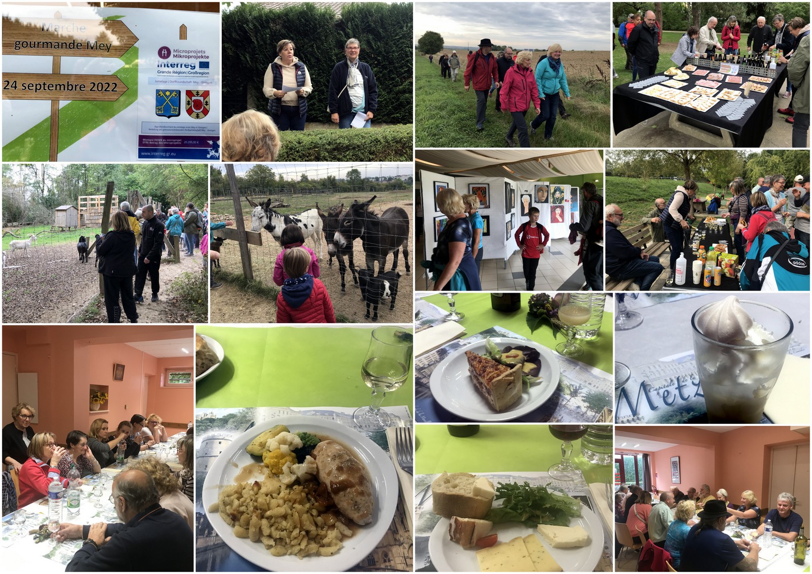 Am 24. September 2022 fand in unserem Partnerdorf Mey bei Metz eine ca. 9 km lange Gourmetwanderung statt. Diese Wanderung war der Abschluss des vom Förderverein Bewahren und Erneuern Gisingen und der Commune de Mey initiierten und durchgeführten INTERREG VA Mikroprojektes „Vertiefung der Dorffreundschaft Mey-Gisingen“.Treffpunkt war morgens an der Mairie von Mey, wo es Croissants, Kaffee und Säfte zum Start gab.