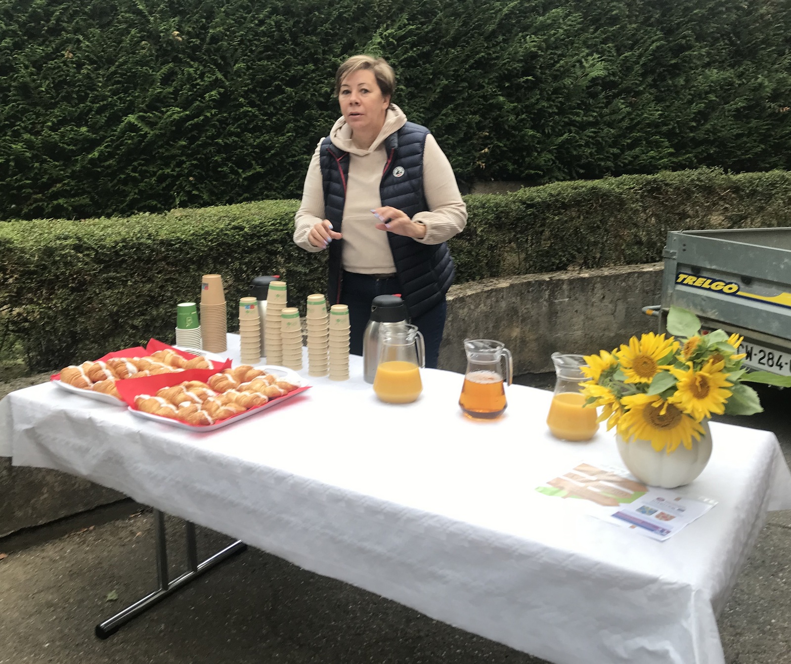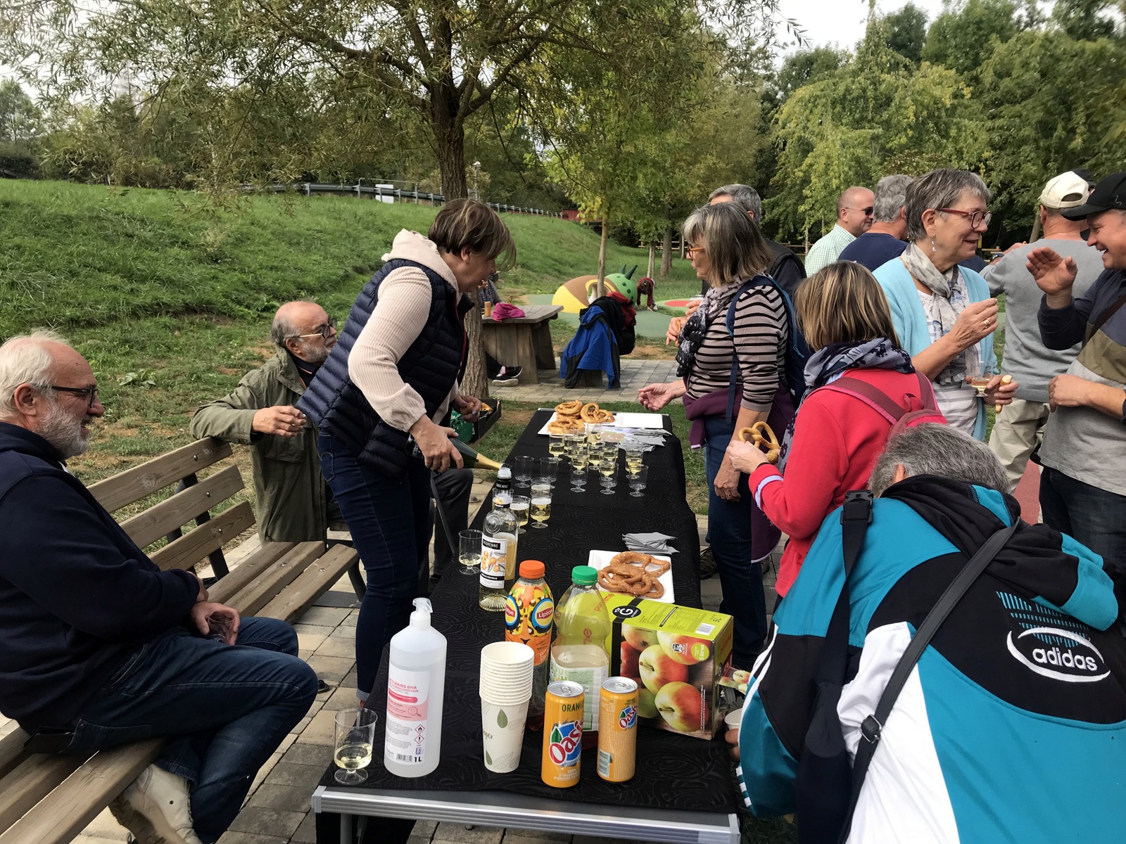 Le 24 septembre 2022, une marche gourmande d’environ 9 km a eu lieu dans notre village partenaire de Mey près de Metz pour clôturer le microprojet INTERREG VA „Approfondissement du jumelage de villages Mey-Gisingen“. Le rendez-vous était fixé le matin à la Mairie de Mey, où des croissants, du café et des jus de fruits étaient offerts pour le départ. Après les mots de bienvenue en allemand et en français de Silvie Roux, maire de Mey, et de Marie Claire Dumas, le groupe a emprunté un tronçon du chemin de Saint-Jacques de Luxembourg-Lorraine pour se rendre à des enclos de chèvres et d’ânes aménagés à Vallières à des fins de pédagogie de la nature. Ensuite, le chemin a mené dans un parc de Vallières où une station de repos avec différents amuse-gueules au fromage et à la saucisse a été proposée. Outre de l’eau et des jus de fruits, il était également possible de déguster diverses bières lorraines primées. Le long du ruisseau de Vallières, le parcours s’est poursuivi jusqu’à Vantoux, où des artistes locaux ont présenté des tableaux et des sculptures remarquables dans la salle communale. Ensuite, une autre pause a pu être appréciée sur l’aire de jeux de Vantoux : En plus de l’eau, du jus et des bretzels, un crémant avec de la liqueur de mirabelle a été offert en guise d’apéritif régional. Le retour vers Mey s’est fait en passant par des zones résidentielles, une chapelle profanée et un ancien cimetière juif à Vantoux. Un délicieux menu à plusieurs plats a ensuite été servi à la mairie : accompagné de vins régionaux une salade et une quiche lorraine, un blanc de poulet avec des légumes et des spätzle à la sauce aux mirabelles, une assiette de fromage et un dessert glacé aux mirabelles. Dans l’ensemble, ce fut l’occasion d’échanger et d’approfondir les connaissances au-delà des frontières. L’ensemble du microprojet sera finalement relaté dans une brochure qui sera mise à disposition à Mey et à Gisingen. voir aussi: Programm MP Vertiefung der Dorffreundschaft Gisingen-Mey et http://www.mairie-mey.fr. Au-delà du microprojet, d’autres manifestations communes sont déjà prévues : Participation de Mey à la journée de deuil national de Gisingen et au marché de l’Avent de Gisingen, ainsi que commune visite au marché de Noël de Metz. Le microprojet a donc été une belle réussite et nous remercions encore une fois tous les participants ainsi que l’Union européenne pour son soutien.