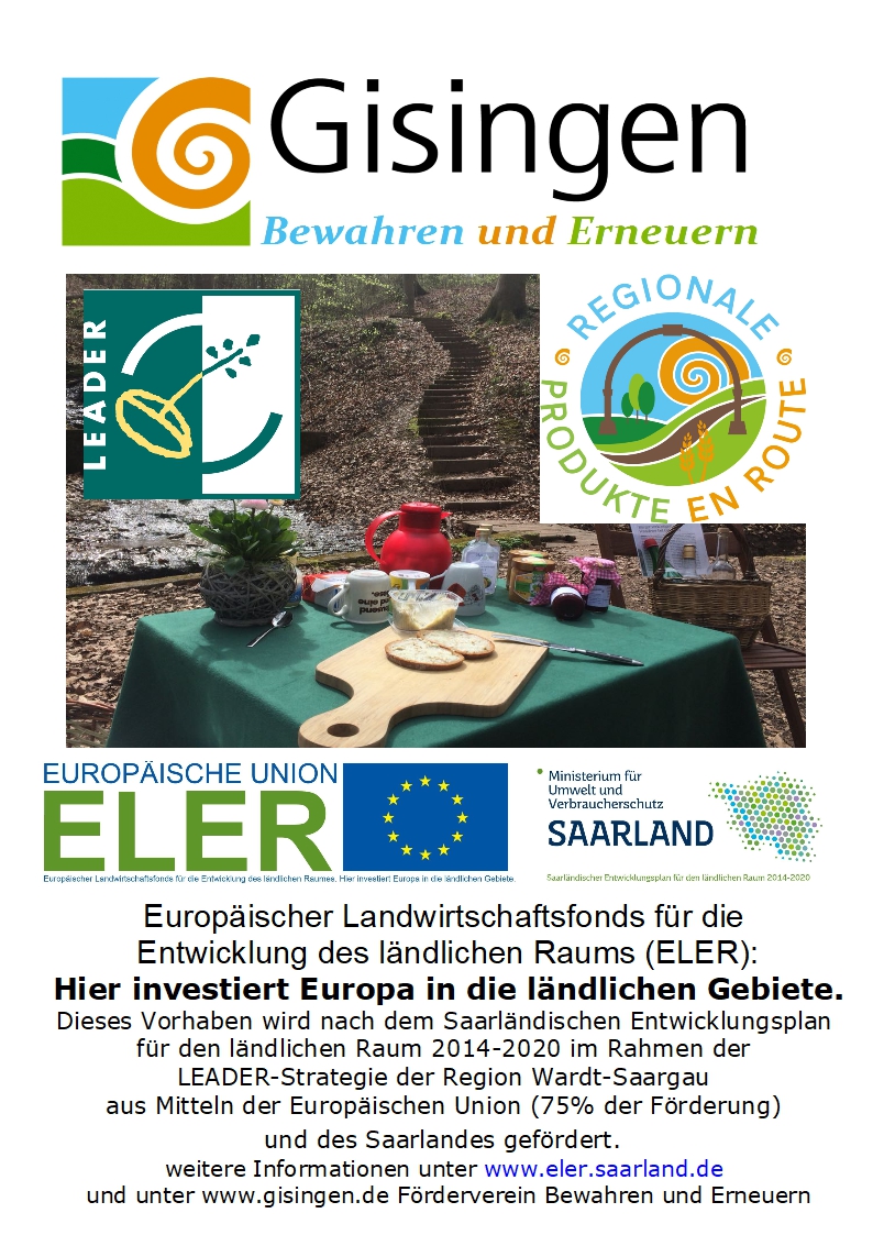 In der Wandersaison 2018 hat der Förderverein Bewahren und Erneuern Gisingen von April bis Ende Oktober im Rahmen des Leader Projektes „Regionale Produkte en route“ die Wanderer auf unseren Wanderwegen (Schnittstelle Gisinger/Hirn-Gallenberg Weg auf dem Gallenberg und Schnittstelle Gisinger/Idesbachpfad an der Kalktufftreppe) an den Wochenenden und an Feiertagen mit allerlei Köstlichkeiten aus der Region versorgt.